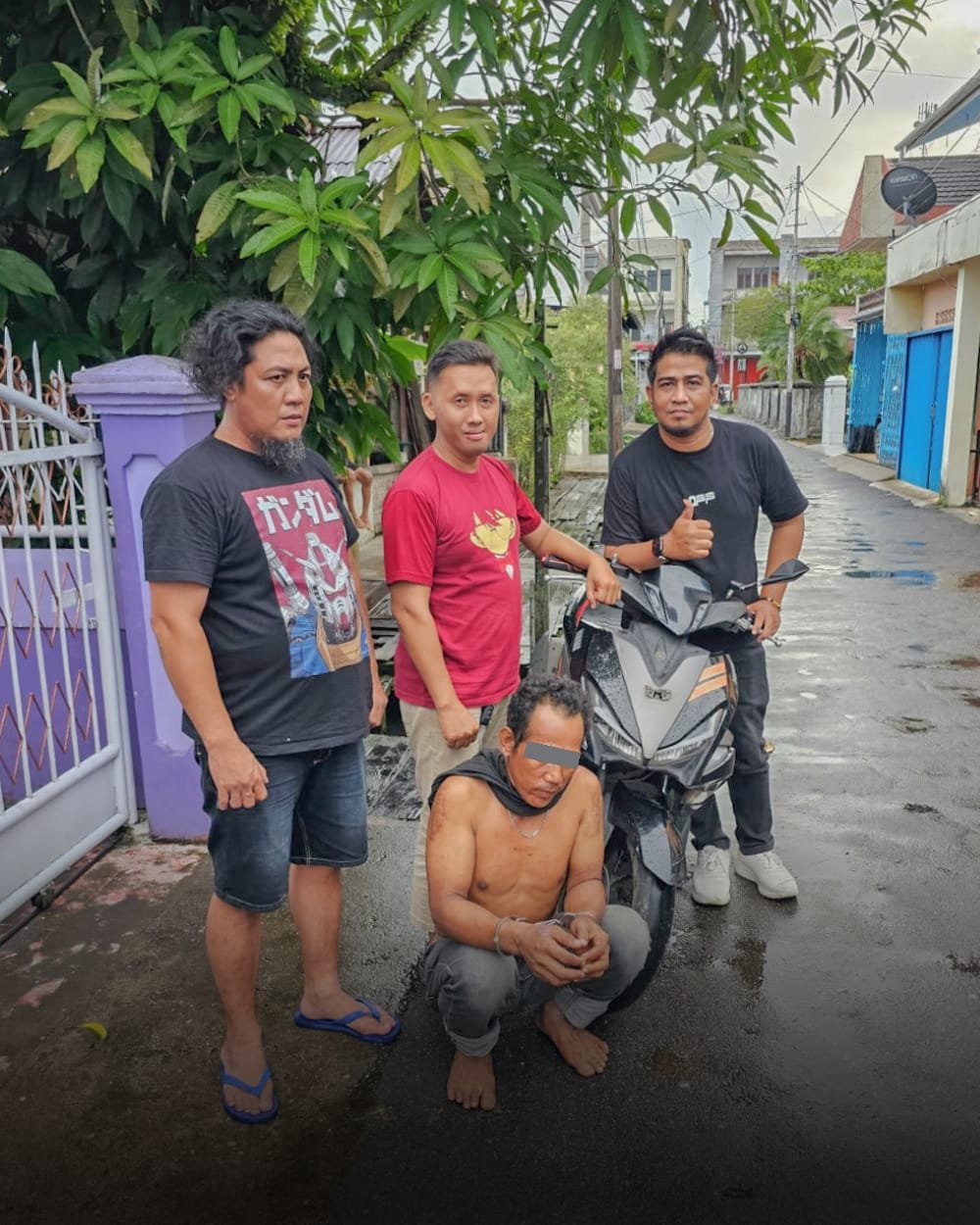 “Sekitar pukul 15.00 WIB Tim Berang-Berang mendapatkan informasi bahwa pelaku sedang berada di Kampung Beting, Pontianak Timur, dan selanjutnya tim melakukan penangkapan terhadap tersangka. Tersangka selanjutnya di bawa ke Gg Abadi Sui. Jawi untuk mengambil barang bukti yang diparkirkan di rumah kosong sekitar rumah keluarga tersangka”, pungkas AKP. Hery