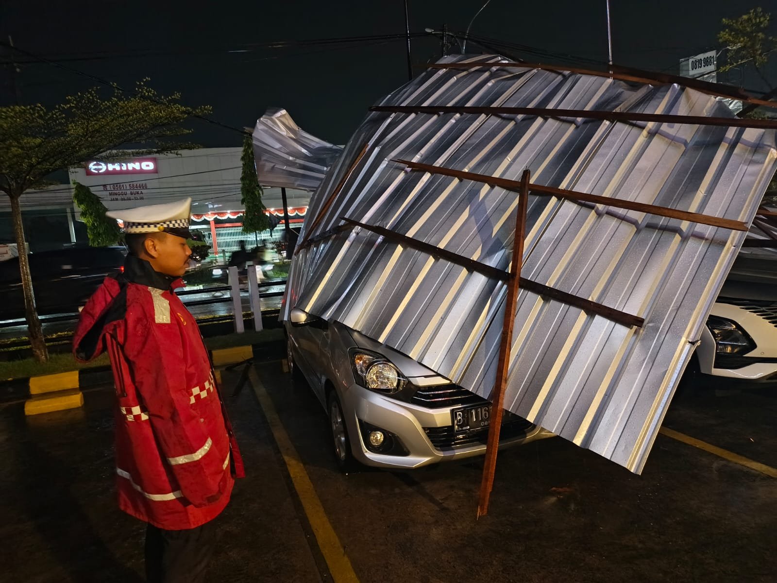 “Awalnya kami kira hanya suara angin. Tapi ternyata atap bangunan seng terbang dan menimpa mobil,” kata Herman warga Imam Bonjol yang saat itu berteduh.