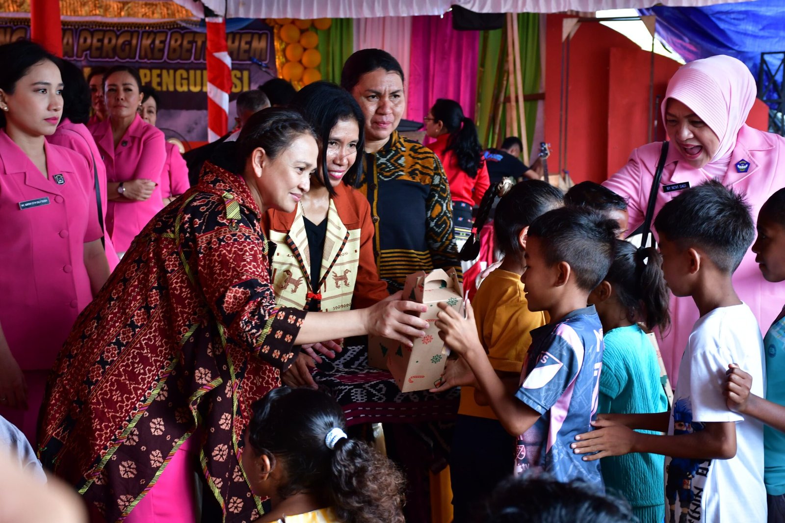 Kedatangan Ketum Bhayangkari Juliati, yang juga merupakan istri Kapolri Jenderal Pol. Listyo Sigit Prabowo, disambut antusias oleh anak-anak di lokasi pengungsian. Dalam kesempatan tersebut, ia membagikan kado serta ribuan bingkisan Natal untuk anak-anak, yang kemudian diajak bernyanyi dan merayakan Natal bersama.