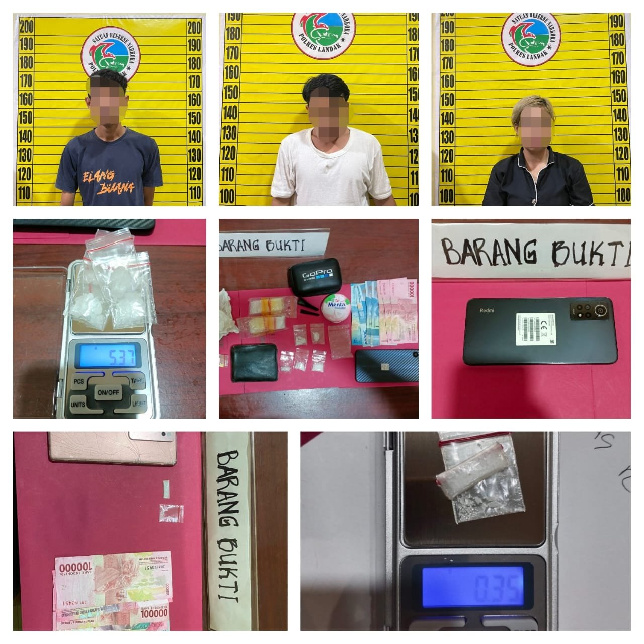 "Barang Bukti (BB) yang kami temukan terhadap Pelaku NR yaitu menemukan 2 buah plastik klip transparan berisikan diduga narkotika jenis shabu, 1 unit HP Vivo V29 warna Velvet Red, dan 1 dompet warna abu-abu berisikan uang sejumlah Rp 450.000, selanjutnya Barang Bukti itu kami akan amankan dan dibawa ke Kantor Polres Landak," ungkap AKP Asep Tabroni, SH.