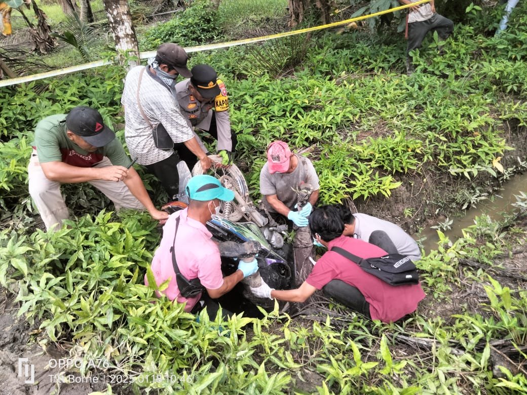 Menurut saksi mata, Lina (50), korban masuk kedalam Parit dengan lebar Parit ± 50 cm dengan posisi Badan korban tertimpa kendaraan motor dan kepala posisi dibawah ( masuk dalam parit ), dan keterangan saksi bahwa korban sudah tidak bernyawa. Lina melihat kejadian tersebut saat hendak pergi ke kebun. Ia langsung memberitahukan kepala dusun, Matni, yang kemudian melaporkan kejadian tersebut ke Polsek Tekarang.