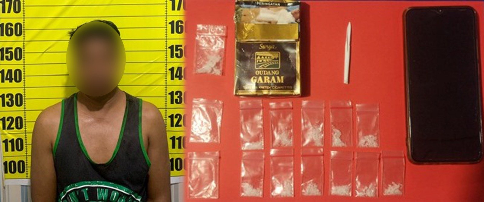 Dari hasil penggeledahan, ditemukan 12 paket plastik bening berklip yang berisi kristal putih diduga narkotika jenis sabu, satu kotak rokok Surya warna coklat, satu sendok sabu yang terbuat dari pipet plastik, serta sebuah unit handphone merk Oppo warna biru.