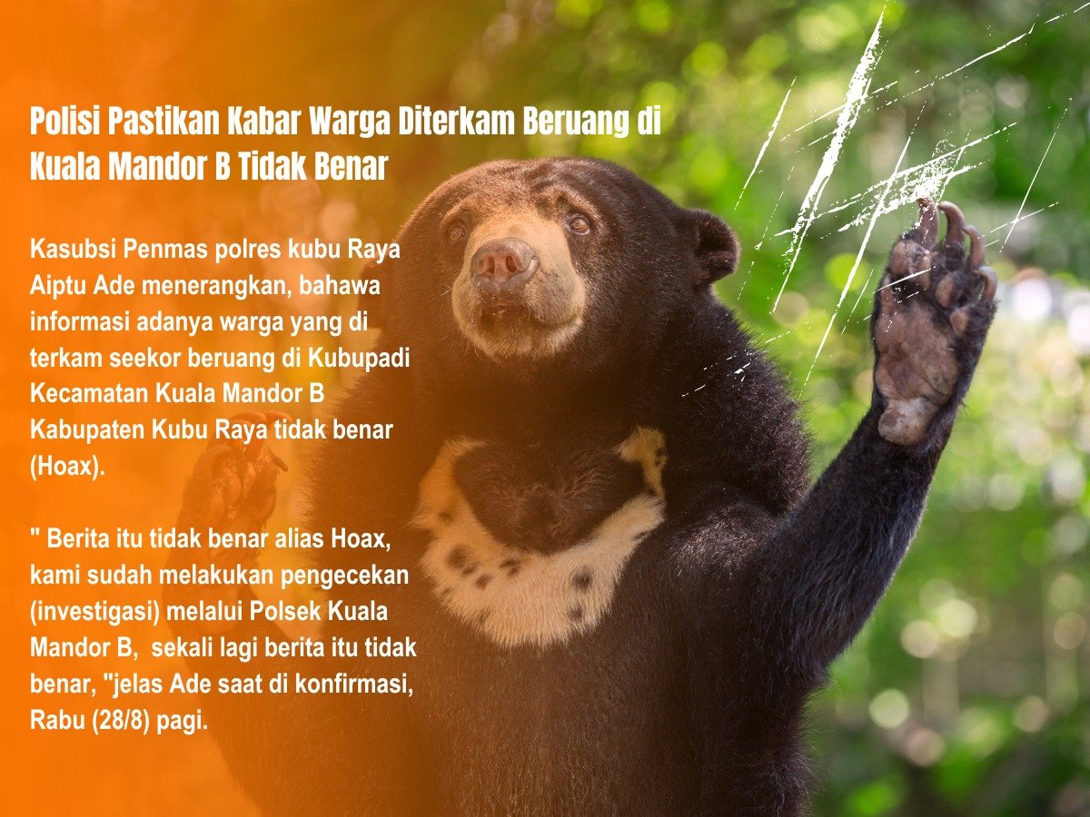 pontianakmerekam.net/, KUBU RAYA – Kasubsi penmas polres kubu raya Aiptu Ade menerangkan, bahawa informasi adanya warga yang di terkam seekor beruang di Kubupadi Kecamatan Kuala Mandor B Kabupaten Kubu Raya tidak benar (Hoax).