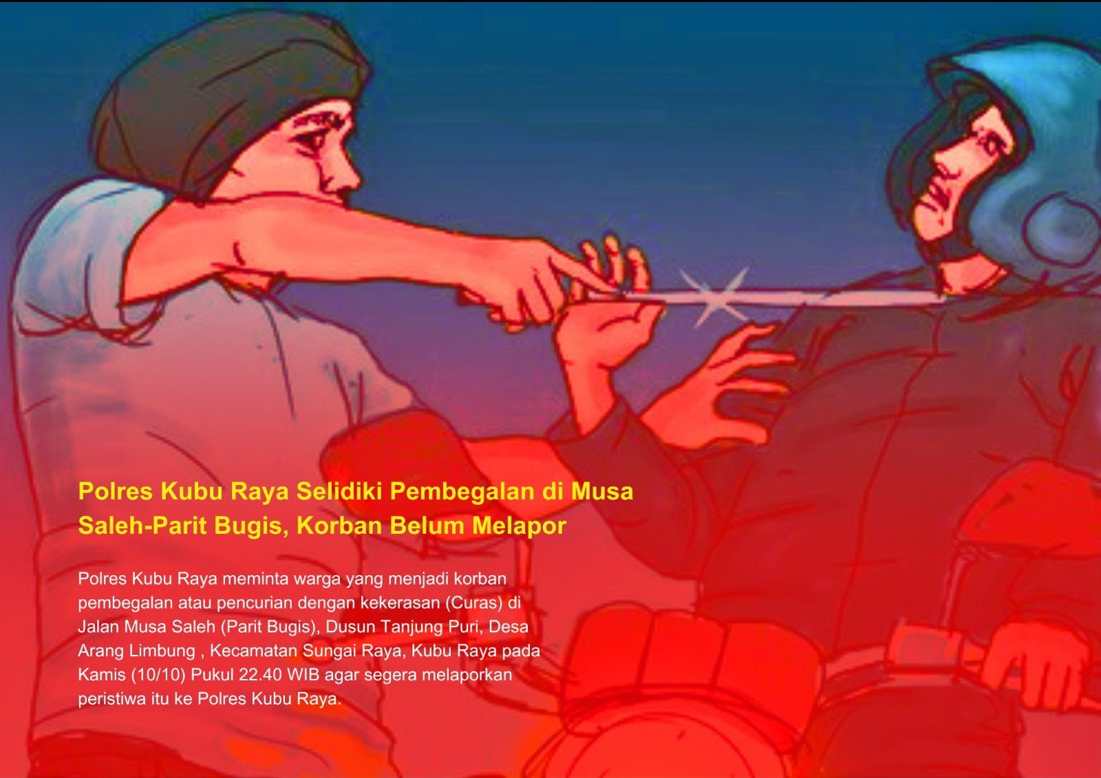 pontianakmerekam.net/, KUBU RAYA – Polres Kubu Raya meminta warga yang menjadi korban pembegalan atau pencurian dengan kekerasan (Curas) di Jalan Musa Saleh (Parit Bugis), Dusun Tanjung Puri, Desa Arang Limbung , Kecamatan Sungai Raya, Kubu Raya pada Kamis (10/10) Pukul 22.40 WIB agar segera melaporkan peristiwa itu ke Polres Kubu Raya.