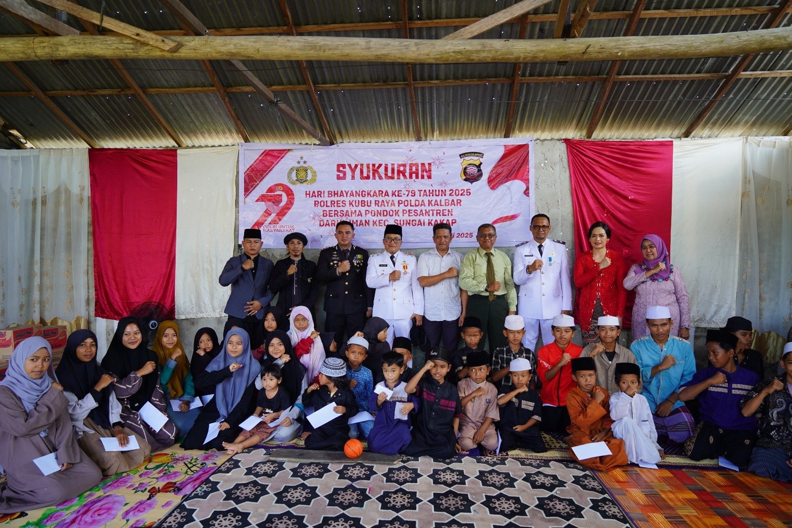 KUBU RAYA – Semangat Hari Bhayangkara ke-79, Polres Kubu Raya bersama Pemerintah Kabupaten Kubu Raya menggelar kegiatan Bhakti Sosial dan Syukuran di Pondok Pesantren Darul Iman, Gang Aiman, Desa Punggur Kecil, Kecamatan Sungai Kakap, Selasa (1/7/2025) siang.