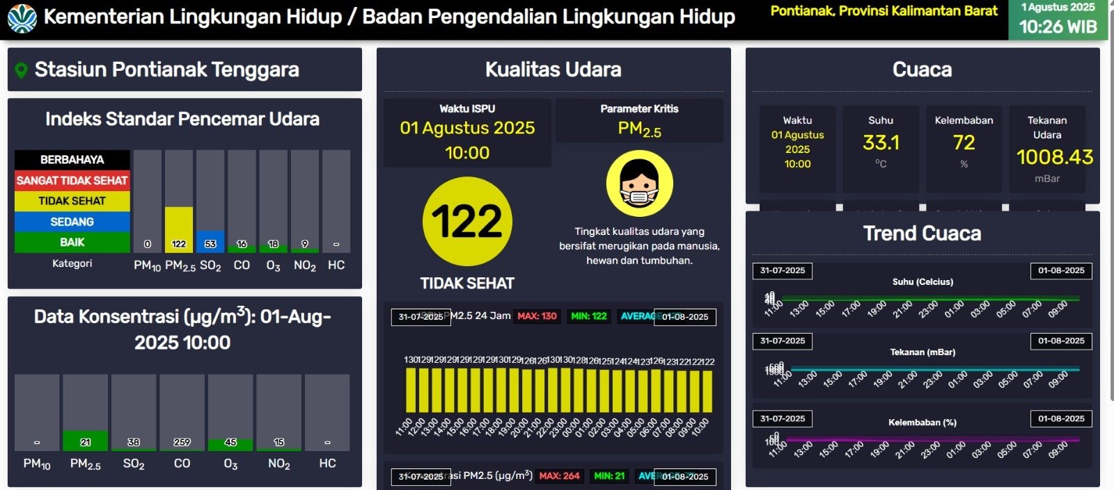 Menurutnya, berdasarkan data dari stasiun Pemantau Kualitas Udara (AQMS) Pontianak, indeks kualitas udara pada Jumat, 1 Agustus 2025 pukul 10.00 WIB, tercatat berada di angka 122 dengan kategori TIDAK SEHAT, terutama karena tingginya kadar partikel halus PM 2,5. Temperatur udara saat itu tercatat di angka 33,1°C.