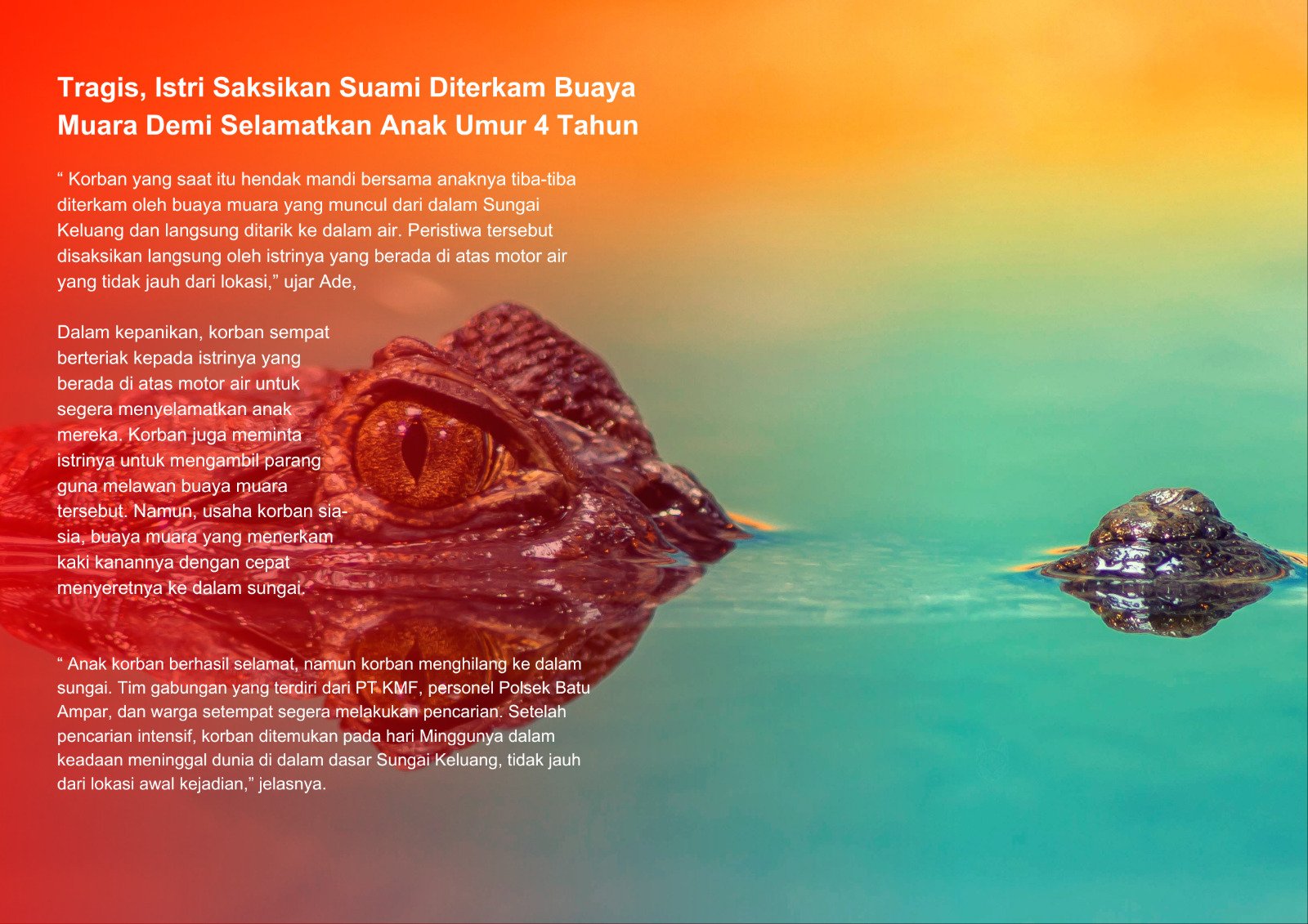 “ Korban yang saat itu hendak mandi bersama anaknya tiba-tiba diterkam oleh buaya muara yang muncul dari dalam Sungai Keluang dan langsung ditarik ke dalam air. Peristiwa tersebut disaksikan langsung oleh istrinya yang berada di atas motor air yang tidak jauh dari lokasi,” ujar Ade, Senin (23/9) pagi.