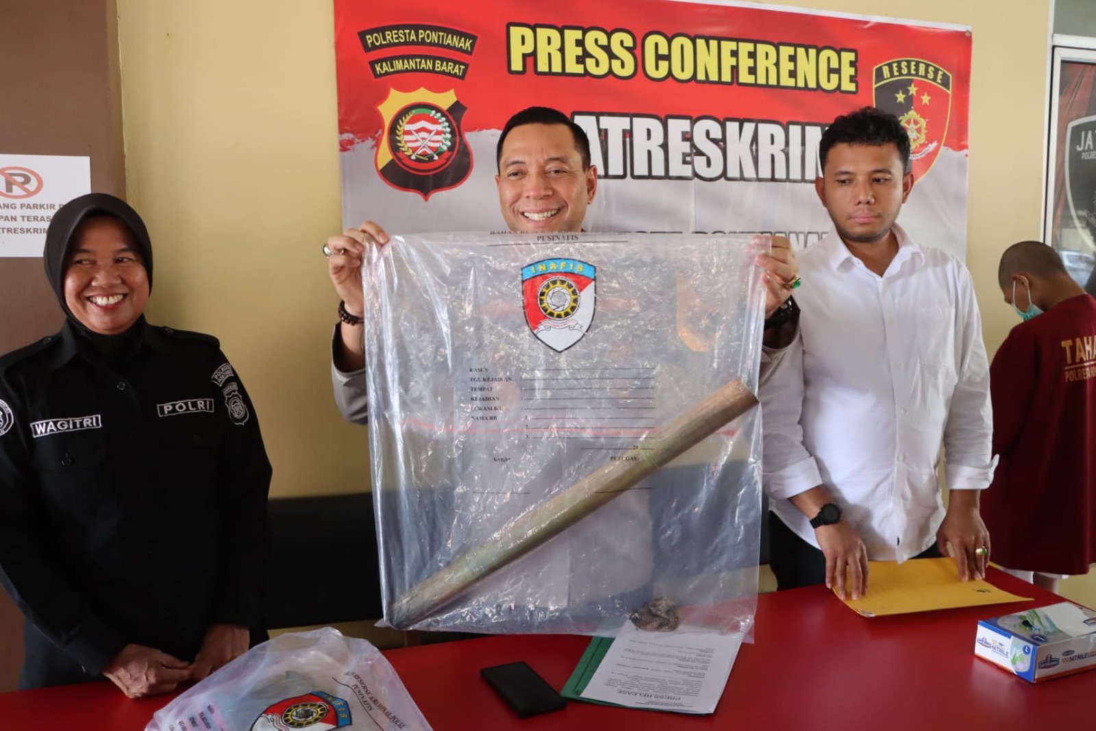 Kapolresta Pontianak Kombes. Pol. Adhe Hariadi, S. I. K., M. H., yang didampingi Kasat Reskrim dan Kasi Humas menjelaskan dua tersangka berhasil diamankan unit Jatanras Polresta Pontianak salah satunya berusia dibawah umur.